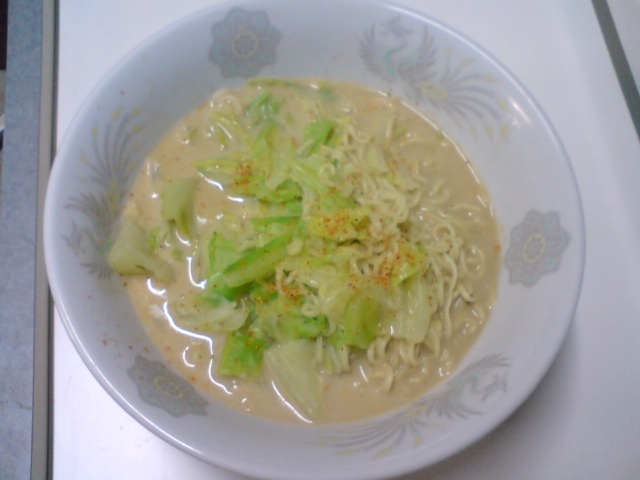 材料:即席めん(味噌)1人前、キャベツ適量、牛乳100ml。